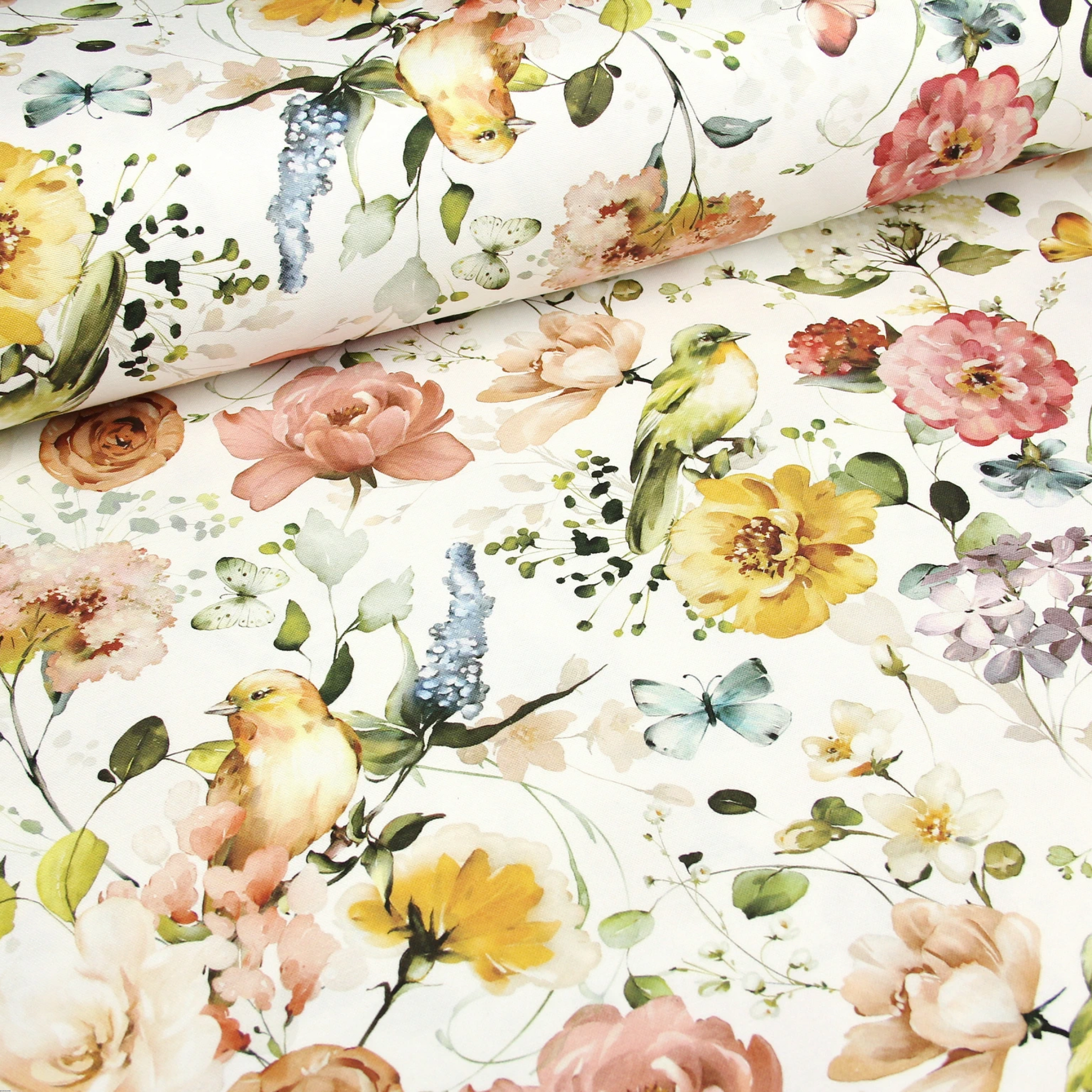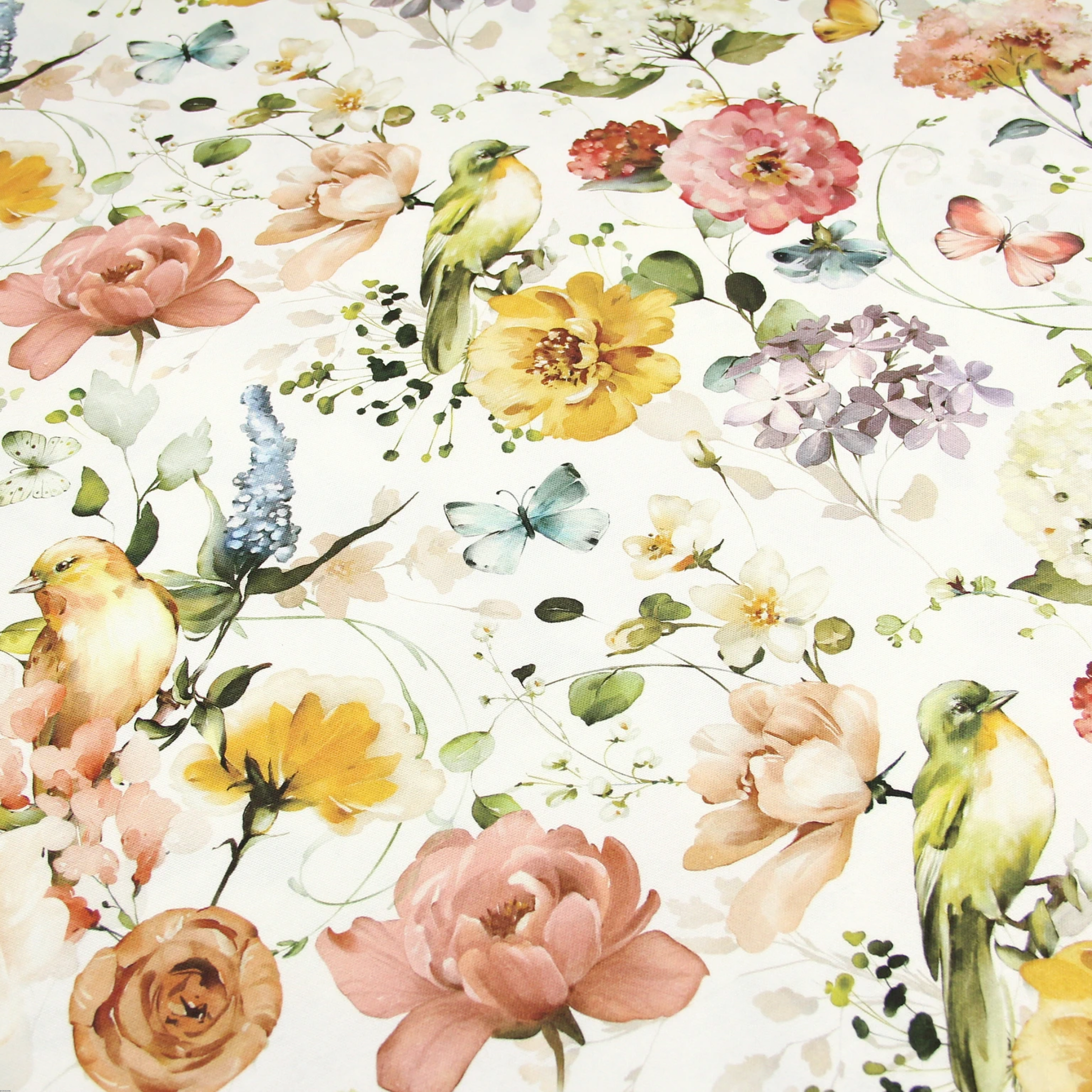 Elegancki i bardzo romantyczny obrus z przepięknym, watercolorowym wzorem kwiatów i ptaków. Delikatne żółte, różowe i fioletowe kwiaty w połączeniu z małymi ptaszkami i motylami tworzą lekki, wiosenno-letni klimat idealny do jasnych, romantycznych wnętrz.