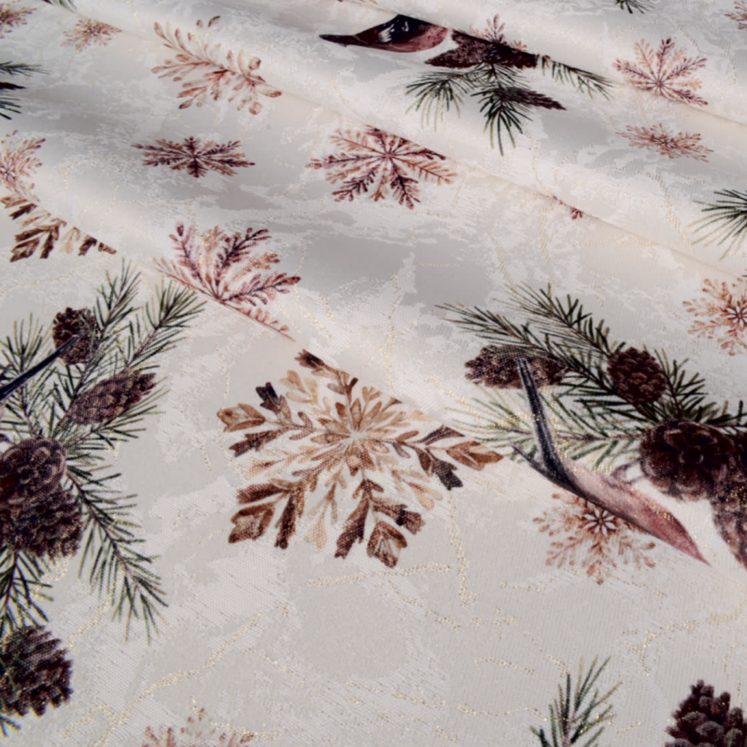 Tkanina świąteczna lureksowa ze śnieżynkami i ptaszkami – materiał na obrus zimowy